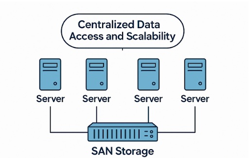 • SAN storage centralizes high-speed data access, enabling seamless performance and organizational scalability.